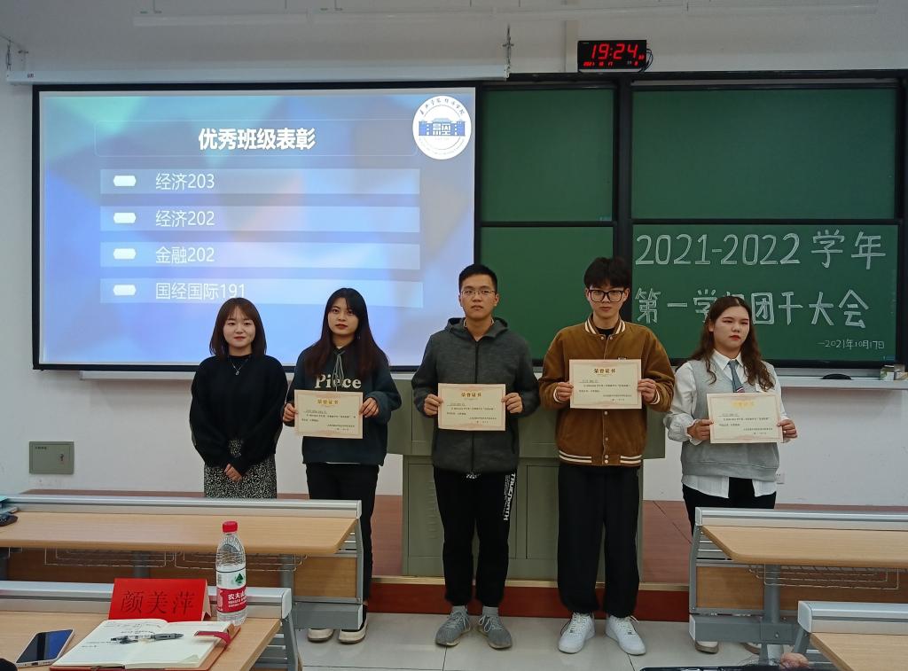 随后大会进行了表彰和分享环节。梅嘉琦对2020-2021学年第二学期班团考核的优秀班级进行了表彰,经济203作为优秀团支部进行了工作经验分享。林佳颖同学总结了上学期团支部工作开展情况,并对本学期的工作进行了布置和安排;裘馨怡同学结合自身经历为各位团干开展工作提供了建议。